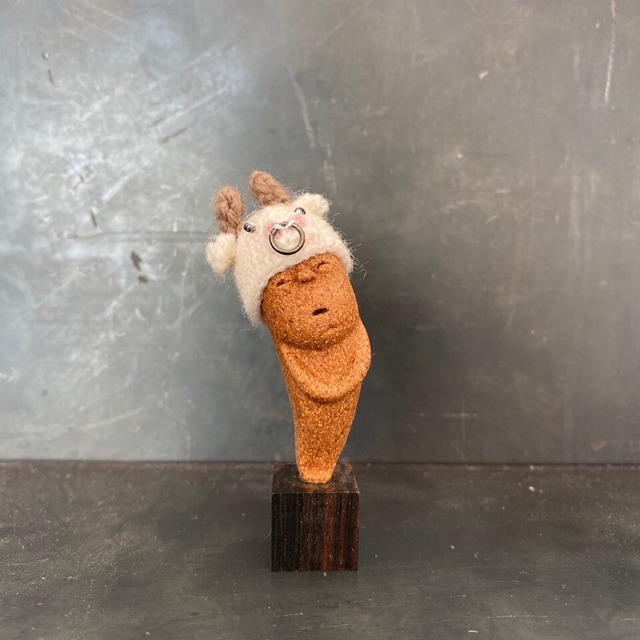 素材:コルク粘土、木の実(ブラックシトン) サイズ:約 全長 7.2㎝ 重さ11g 制作工程 1.ドライの木の実を水につけて中身の種を取り除き、口を大きめに開きます 2.乾燥させます 3.顔、ボディの成形→乾燥→成形の繰り返します 4.ひたすらペーパー掛け 5.マジックオイル→乾燥の繰り返し 6.土台づくり サイコロ状の木と芯となる鉄棒を差込みます 7.TOMOTと土台をボンドで繋ぎます 8.乾燥させます 9.ようやく完成